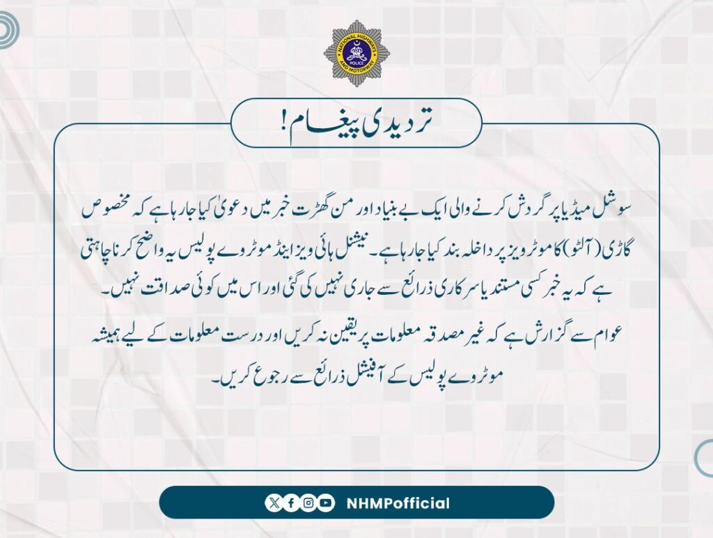 “A baseless and misleading claim is circulating on social media, stating that a specific vehicle (Alto) has been banned from entering the motorway. The Motorway Police would like to clarify that this news is not based on any credible or official source and holds no truth. The public is urged not to trust or spread unverified information. For accurate and authentic updates, always refer to official sources of the Motorway Police.”